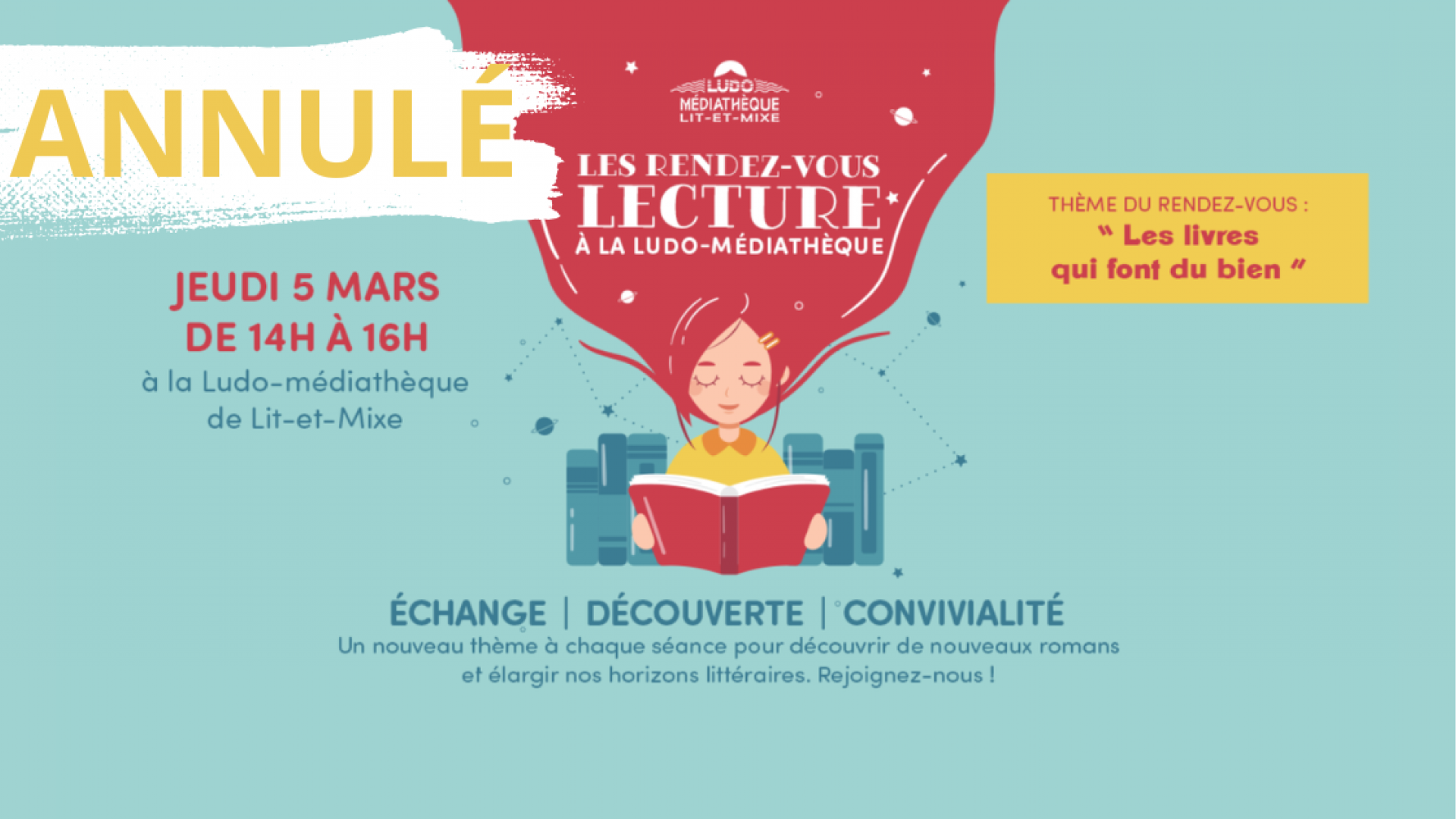 ANNULÉ : Les rendez-vous lecture Publié le 26 février 2026 / Dernière modification le 04 mars 2026 ANNULÉ : Les rendez-vous lecture Publié le 26/02/2026 - Dernière modification le 04/03/2026 Le jeudi 05 mars 2026 de 14:00 à 16:00 L'événement initialement prévu à la date du jeudi 5 mars 2026, est malheureusement annulé. Merci de votre compréhension.