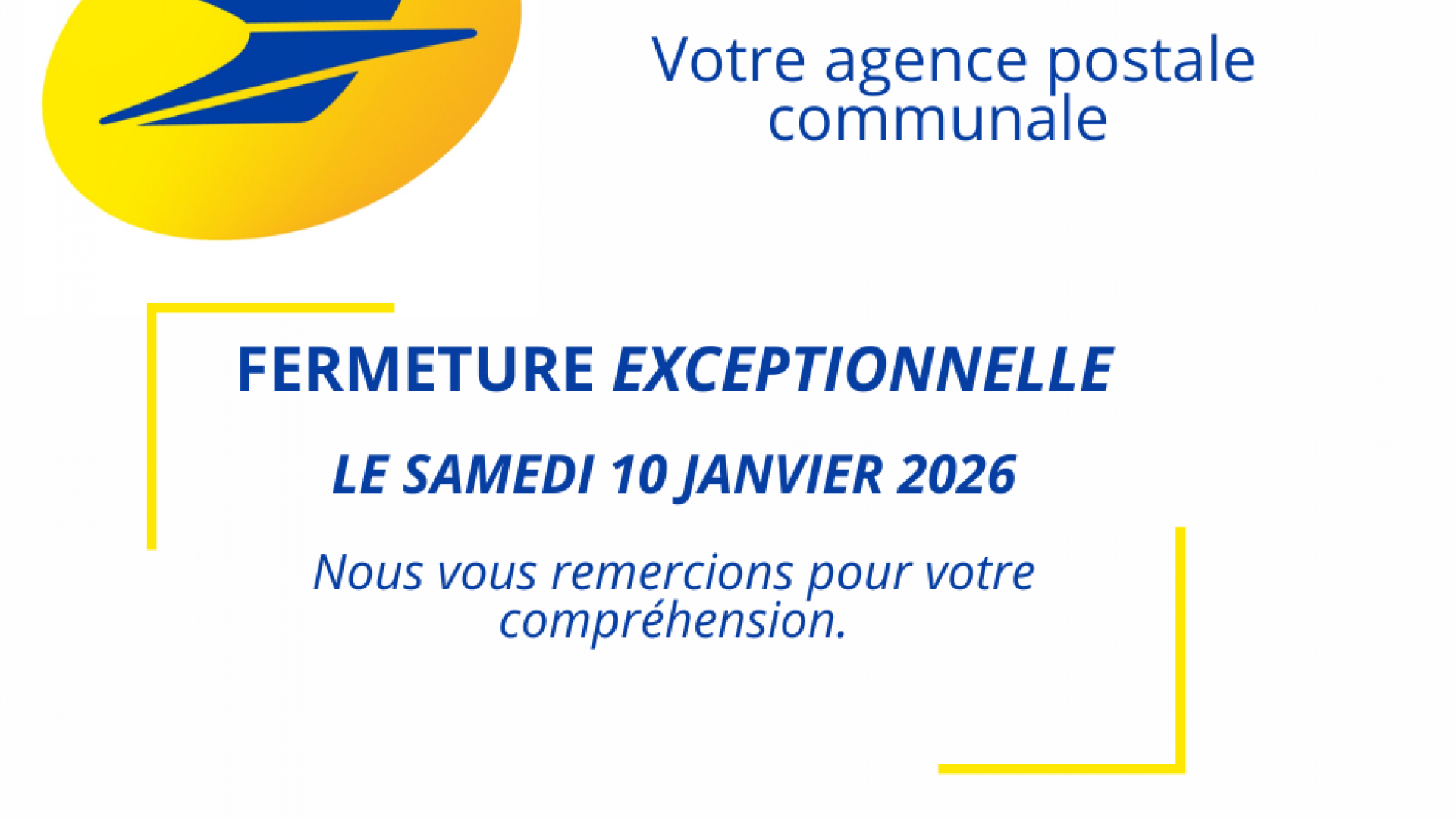 Fermeture exceptionnelle de votre agence postale Publié le 09 janvier 2026 / Dernière modification le 09 janvier 2026 Fermeture exceptionnelle de votre agence postale Publié le 09/01/2026 - Dernière modification le 09/01/2026 Nous vous informons que votre agence postale sera exceptionnellement fermée ce samedi 10 janvier 2026.