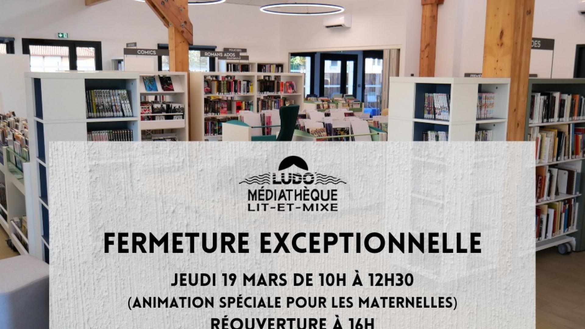 Fermeture exceptionnelle de votre ludo-médiathèque Publié le 17 mars 2026 / Dernière modification le 17 mars 2026 Fermeture exceptionnelle de votre ludo-médiathèque Publié le 17/03/2026 - Dernière modification le 17/03/2026 La ludo-médiathèque sera exceptionnellement fermée ce jeudi 19 mars 2026, le matin. La réouverture se fera à partir de 16h00 l'après-midi.Merci pour votre compréhension.