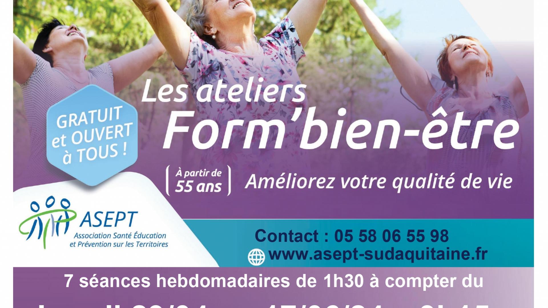 - l'Atelier Form'Bien-Être : du 29 avril au 17 juin 2024 à Saint-Julien-en-Born et à Léon. Cet atelier consiste à redécouvrir son corps, favoriser la détente, développer son énergie, maîtriser sa respiration, optimiser sa posture, développer sa souplesse, mieux gérer son stress et améliorer sa qualité de sommeil.